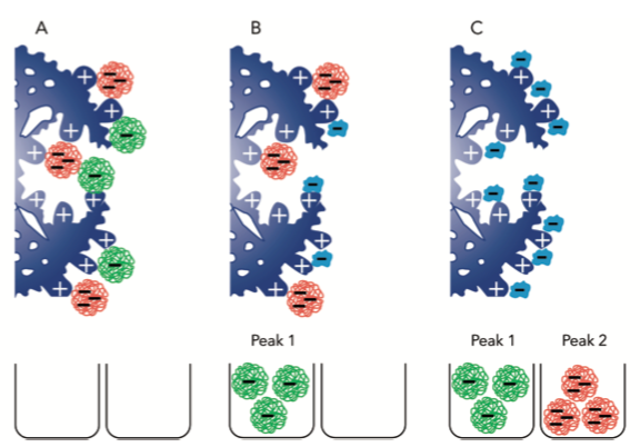 Proteínas com interações iônicas fracas são as primeiras a eluir da coluna. No caso de cromatografia de troca catiônica, as proteínas com cargas negativas mais fracas são as primeiras a eluir (Figura 1B). Com um aumento na concentração do sal, as proteínas com interações mais fortes eluem da coluna (Figura 1C).