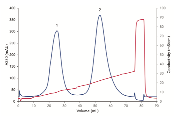 α-Chimotripsinogeno A (pI 8,97) e Lisosima (pI 11,35) são proteínas que têm alto pI, o que as torna candidatas ideais para a cromatografia de troca catiônica (Figura 2). Ambas proteínas se ligam sob baixa concentração salina à resina. Durante o passo de lavagem, que remove proteínas não ligantes potenciais, só uma pequena quantidade de impurezas eluíram da coluna. α-Chimotripsinogeno A eluiu primeiro da coluna devido ao seu pI mais baixo de 8,97 (Figura 2, pico 1).