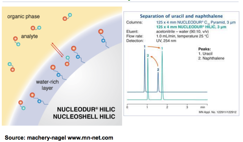 Fonte: Mark Woodruff em LC GC a coluna. Os Ins e Outs of HILIC Chromatography 24 de janeiro de 2011, Vol.7, questão 1 | Fonte: Mark Woodruff em LC GC, a coluna. Os Encomendados da Cromatografia HILIC - 24 de janeiro de 2011, Vol.7, edição 1