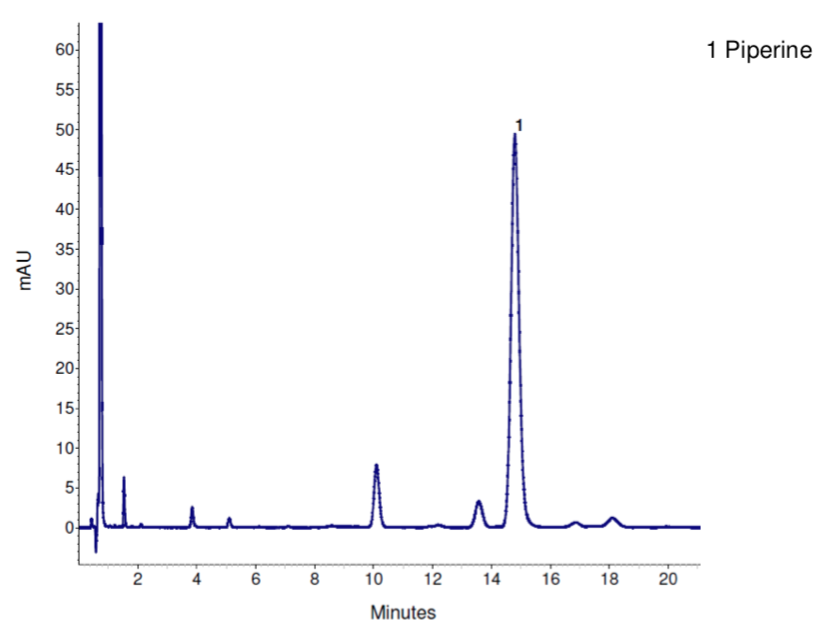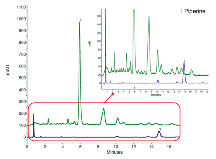O sistema é capaz de executar uma análise sensível e rápida da fração purificada de piperina. A aplicação de uma coluna C8 clássica do BlueShell resulta em picos muito estreitos e, com isso, a uma resolução muito boa e a limites de detecção baixos.