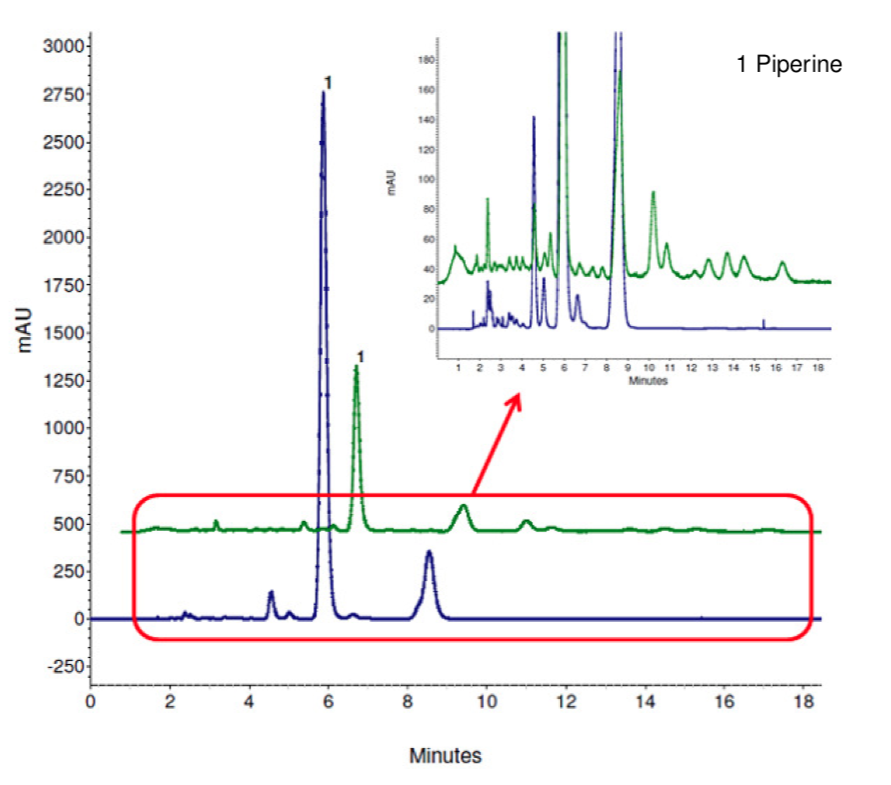 O sistema é capaz de executar uma análise sensível e rápida da fração purificada de piperina. A aplicação de uma coluna C8 clássica do BlueShell resulta em picos muito estreitos e, com isso, a uma resolução muito boa e a limites de detecção baixos.